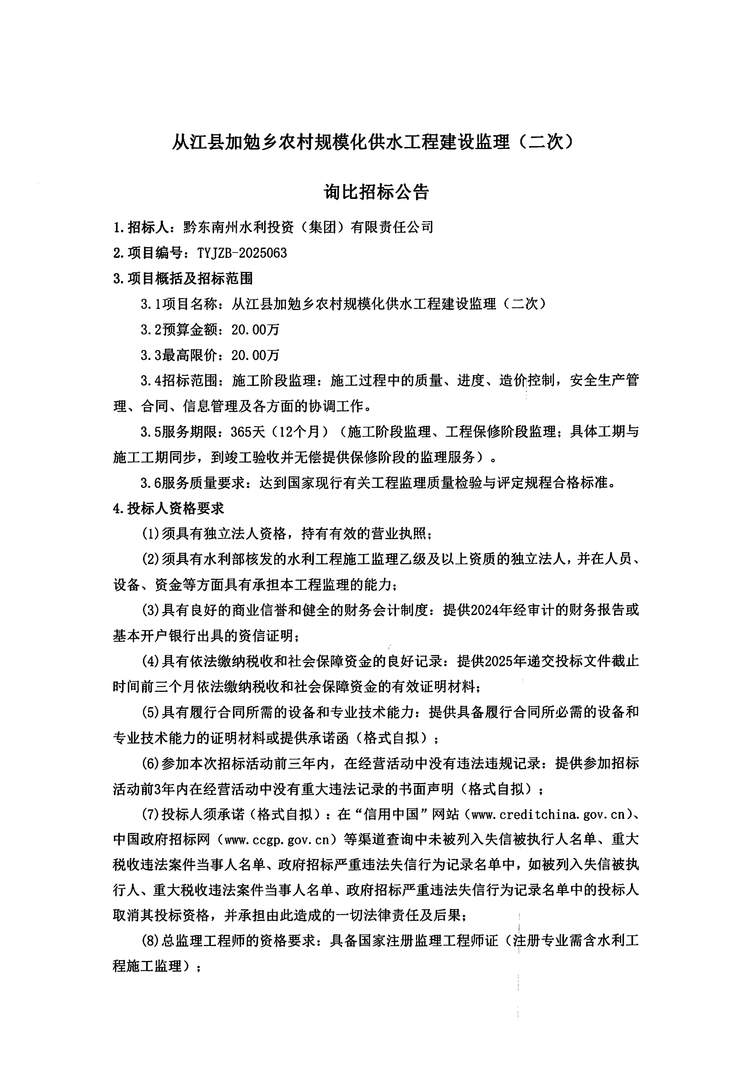 从江县加勉乡农村规模化供水工程建设监理(二次)询比招标公告