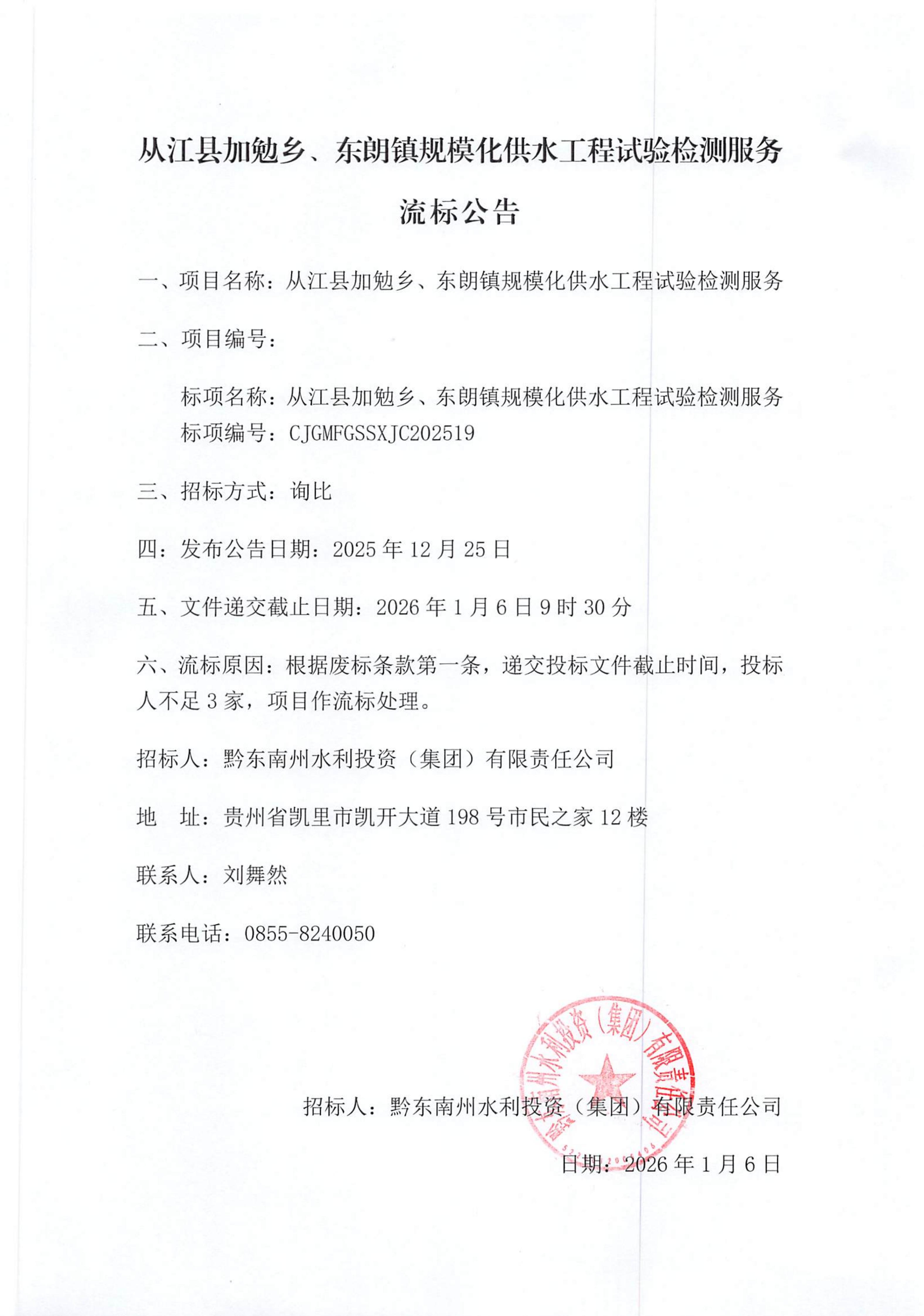 从江县加勉乡、东朗镇规模化供水工程试验检测服务流标公告