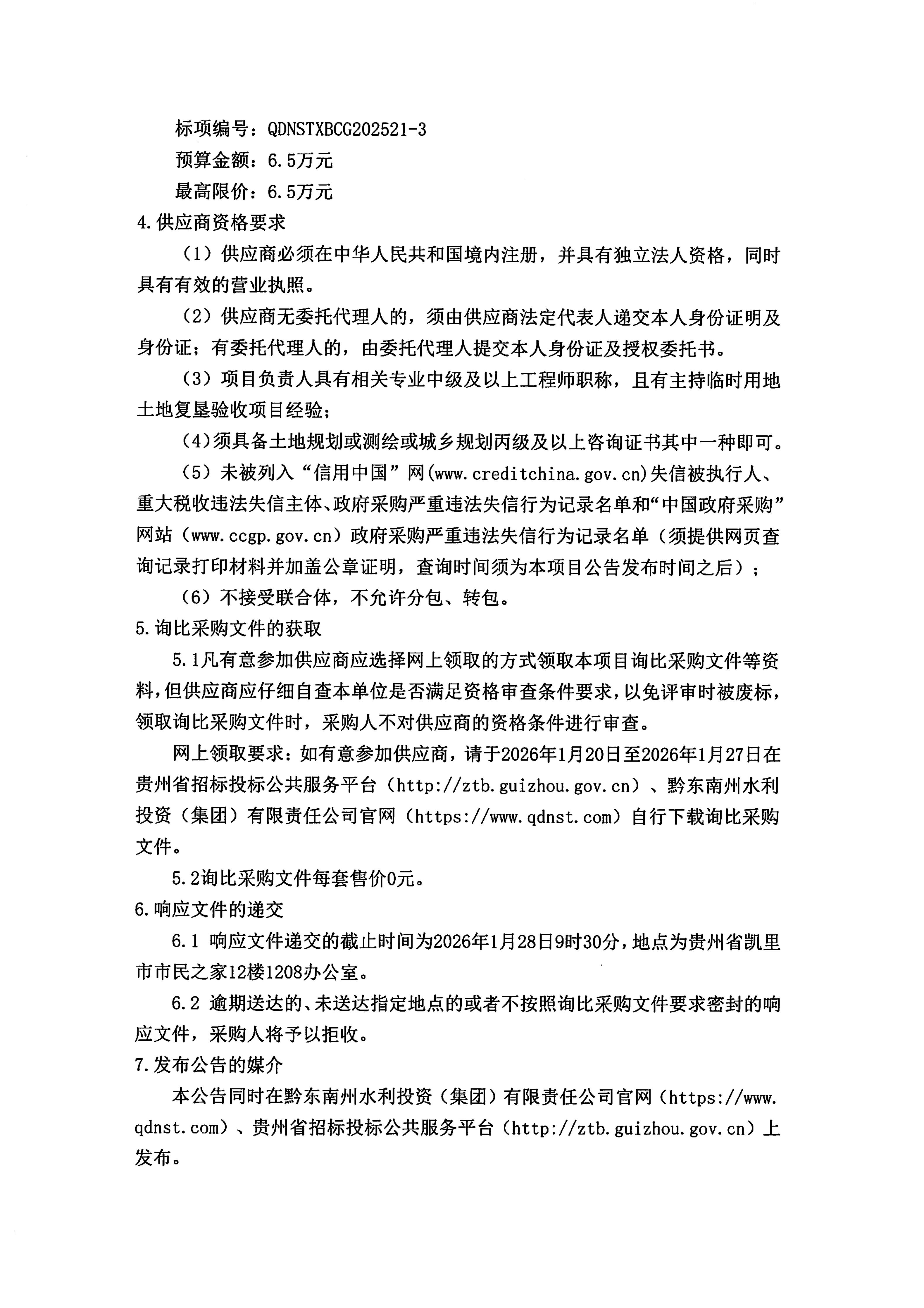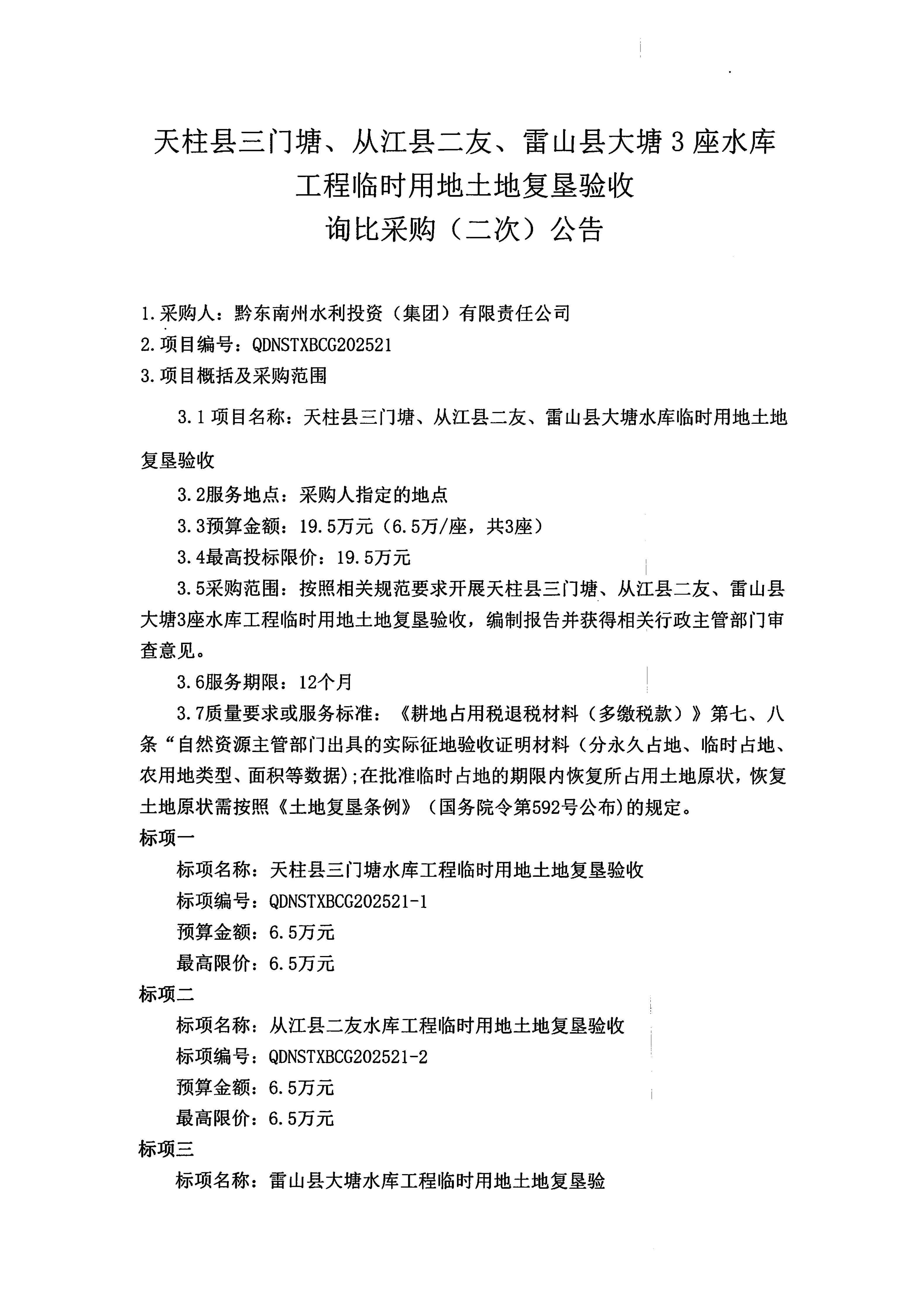天柱县三门塘、从江县二友、雷山县大塘3座水库工程临时用地土地复垦验收询比采购(二次)公告